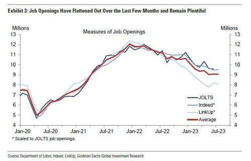 JOLTs:同样值得注意的是,6月份的JOLTs数据(与劳工统计局定于明天发布的7月份就业数据相比,延迟了一个月)报告的职位空缺为958.2万个,低于预期的961万个,低于之前的982.4万个。富国银行表示,“自美联储于2022年3月开始收紧政策以来,职位空缺减少了20%,而失业率呈横向趋势,”并补充说,“这标志着朝着通胀在没有衰退的情况下消退迈出了令人鼓舞的一步,但由于价格增长仍在上升,对工人的需求仍在下降,‘软着陆’仍远未确定。”新聘人数和离职人数也双双下滑,表明劳动力市场大幅放缓。