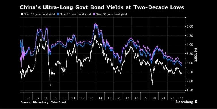 图:中国长期国债收益率降至20年来最低水平 来源:Bloomberg