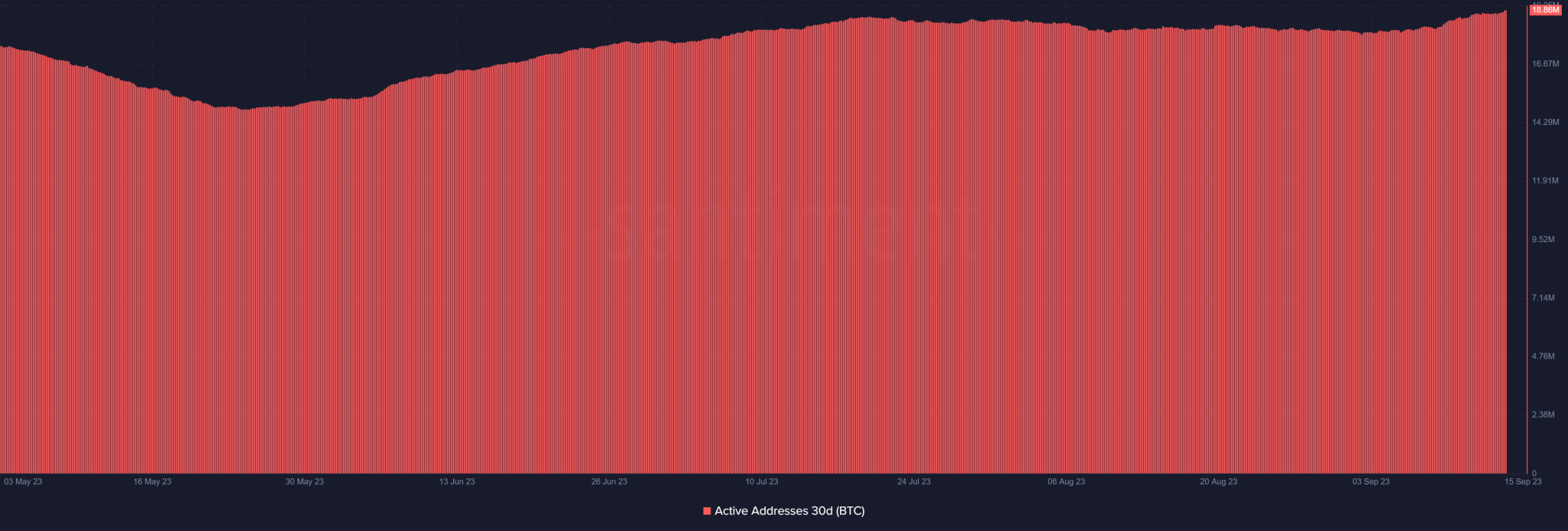 深入研究比特币的活跃地址,30 天活跃地址指标显示出小幅上升趋势。该图表显示,这一上升趋势于9月9日左右开始,当时地址数量约为1810万个。截至撰写本文时,30天活跃地址数量已增至超过1820万个。