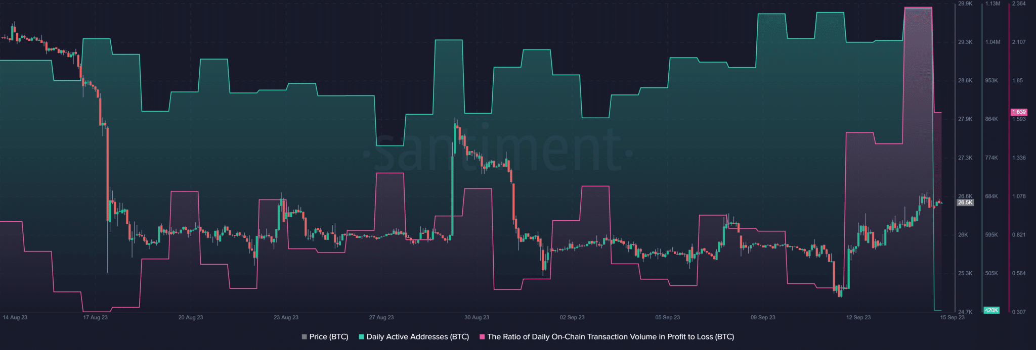此外,Santiment 图表显示每日链上交易量盈亏比同时激增。9月14日,该指标飙升至约2.34,创下最近几周的最高水平。截至撰写本文时,该比率已降至1.6左右。
