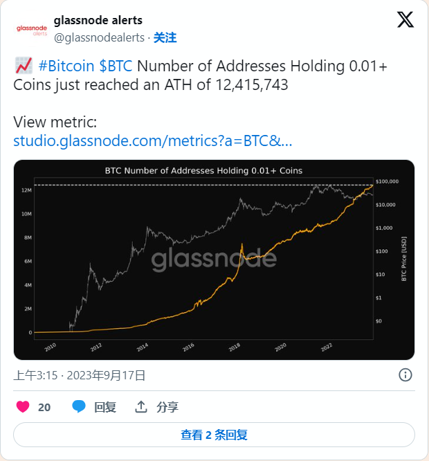 然而,对第一代区块链的需求并未受到影响。根据 Glassnode 最近的更新,持有至少0.01个比特币的比特币钱包数量创下新高。