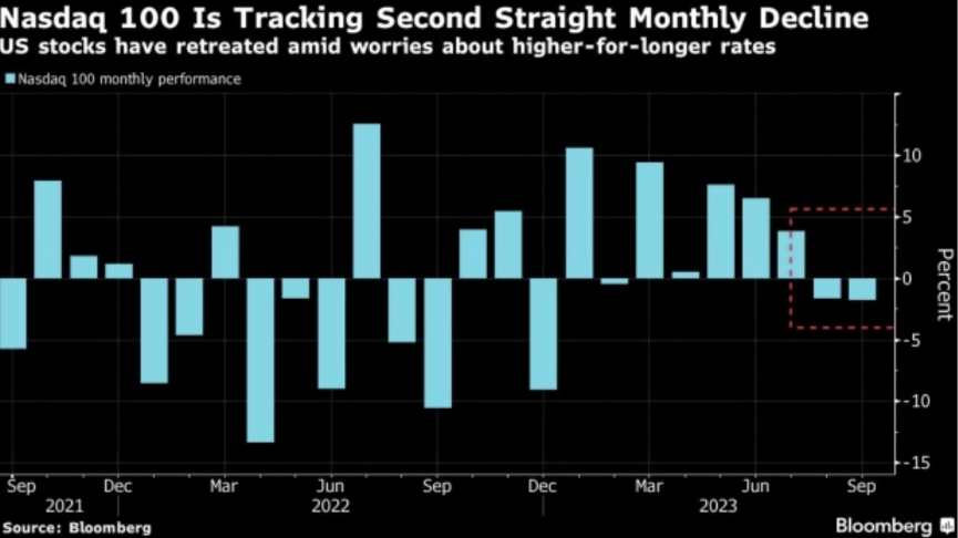 图:纳斯达克100指数在8、9月份两个月内均展现回调 来源:Bloomberg
