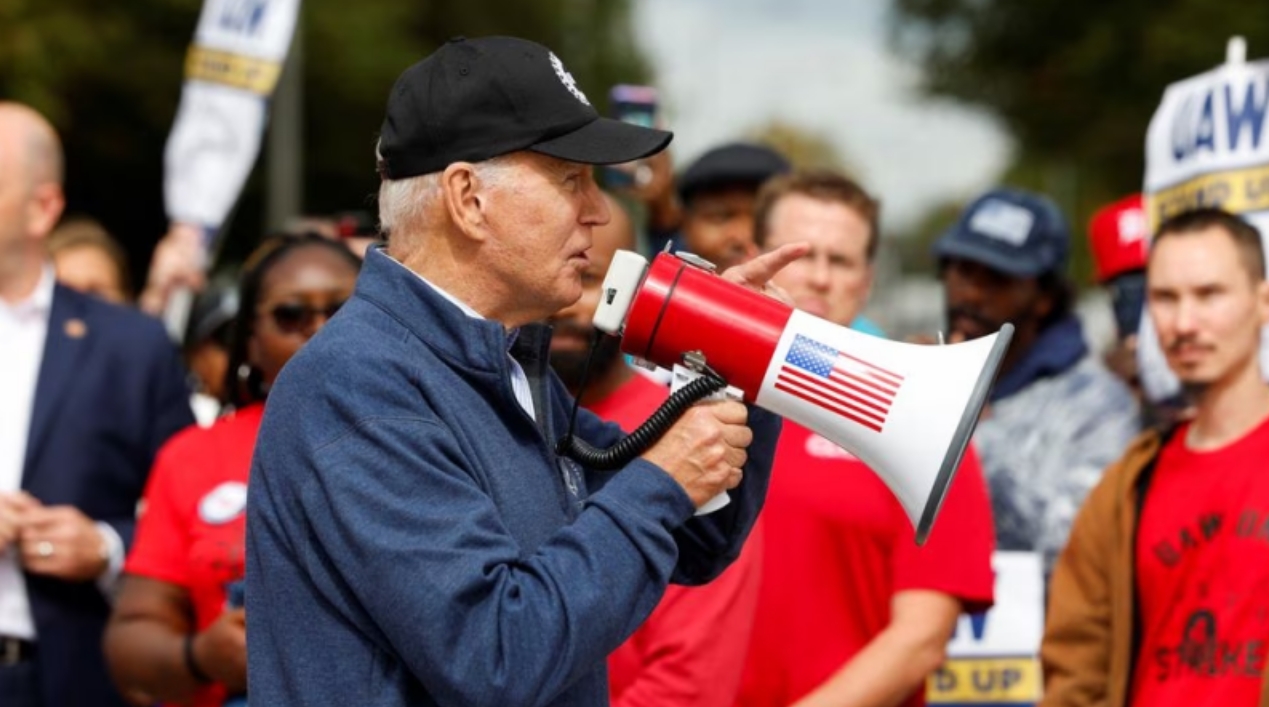 拜登的露面是现代历史上美国总统首次拜访罢工工人,凸显了工会支持在2024年总统选举中的重要性。