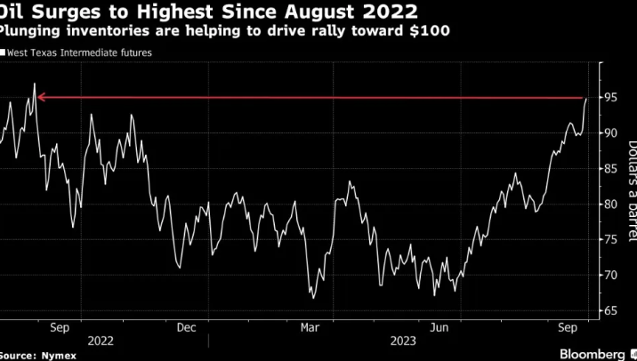 周三公布的官方数据显示,美国原油库存总体降幅超过预期,这证明由于沙特阿拉伯和俄罗斯削减供应,市场正在迅速收紧。自 6 月底以来,WTI 原油价格已飙升了约三分之一,有望创下自 2022 年初以来的最大季度涨幅,这加剧了通货膨胀,并令各国央行感到新的头疼。