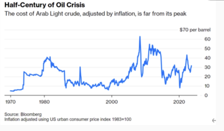 图:半个世纪的石油危机:经通胀调整后的阿拉伯轻质原油价格远低于峰值。来源:彭博新闻社
