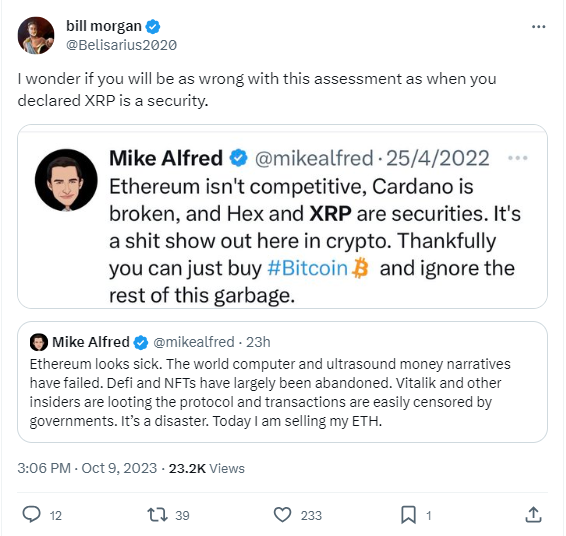 比尔·摩根以他的风格,通过挖掘阿尔弗雷德过去的帖子来反驳。摩根强调了阿尔弗雷德之前的一些预测,加密社区的许多人认为这些预测“被误导了”。阿尔弗雷德此前曾声称 Cardano 是一个“有缺陷”的项目,并将 Hex 和 XRP 标记为证券。