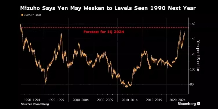 图:瑞穗表示,日元明年可能会跌至1990年的水平 来源:Bloomberg