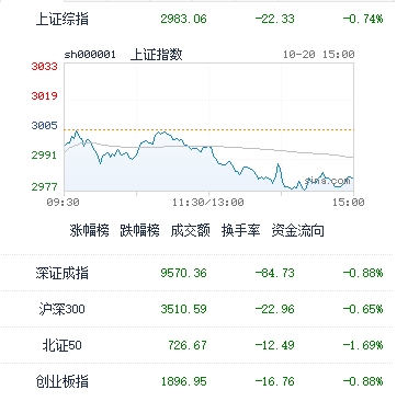 10月20日,A股市场延续调整,午后加速下行。沪指跌破3000点整数关口,深成指、创业板指也创下3年多以来新低。锂矿、风电等新能源板块反弹,而光刻机、芯片股集体调整。房地产板块逆势走强,卫星导航板块走弱。整体来看,个股普遍下跌,成交缩量,北向资金净卖出。