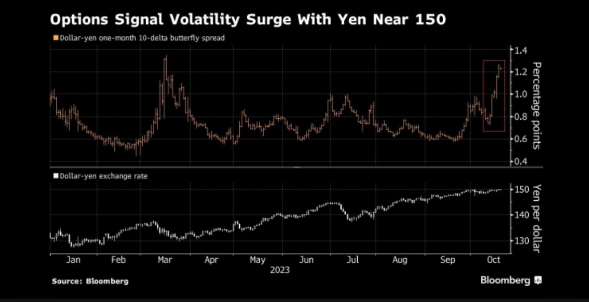 图:美元兑日元接近150,期权市场发出波动率即将上升信号 来源:Bloomberg