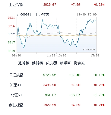11月30日,中国股市出现了窄幅分化的走势,三大指数涨跌不一。大消费板块表现强势,而汽车产业链和半导体芯片股则走弱。整体来看,个股多数下跌,市场成交低迷。