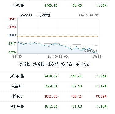 12月13日消息,大盘全天震荡调整,三大指数均跌超1%,创业板指领跌,沪指再度失守3000点整数关口,中国中免、贵州茅台、宁德时代、中国石油等权重股纷纷走低。板块方面,医药板块逆势大涨,金陵药业、通化金马、浙江震元、南京医药等多股涨停。国企改革概念股持续走高,四川金顶6连板,湖南发展、音飞储存等二十余股封板。机器人概念股集体活跃,巨轮智能、杭齿前进等涨停;下跌方面,BC电池概念下挫,钧达股份跌超7%。总体来看,个股跌多涨少,超3500股处于下跌状态,市场成交额依然低迷,今日不足8000亿元,北向资金净卖出近百亿元。