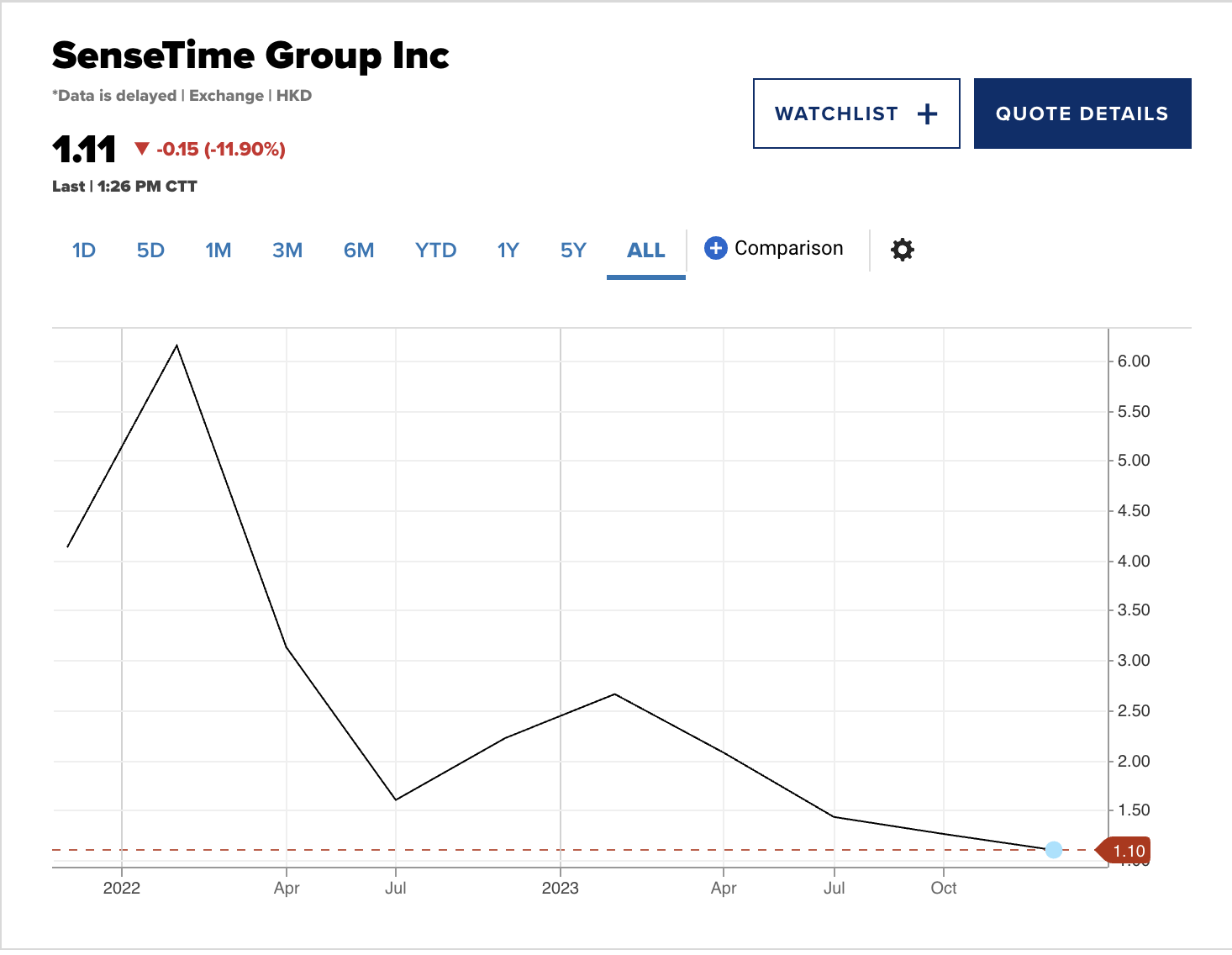 在香港上市的商汤科技(SenseTime)股价周一最低跌至1.03港元(约合0.13美元),根据伦敦证券交易所的数据,这是该公司历史上的最低水平。