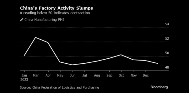 图:中国制造业活动处于收缩区间 来源:Bloomberg