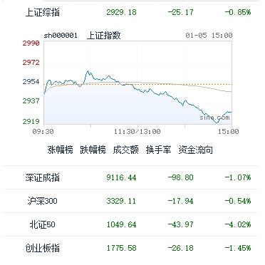 2024年1月5日,A股三大指数今日延续疲软走势,截止收盘,沪指跌0.85%,收报2929.18点;深证成指跌1.07%,收报9116.44点,创阶段新低;创业板指跌1.45%,收报1775.58点,创阶段新低。分板块看,银行股发力护盘,瑞丰银行涨超9%、苏州银行涨超6%,中信银行、杭州银行、成都银行、贵阳银行跟涨;保险板块中,中国人保涨幅0.42%,中国太保、中国平安跟涨;券商股今日早盘异动拉升,国联证券领涨,涨幅2.55%;此外,白色家电、建筑装饰等板块领涨,非金属材料、国防军工、通信设备、教育、传媒、通信等板块跌幅居前。总体来看,今日沪深两市逾4700只个股下跌,沪深两市全日成交额7363亿元,北向资金尾盘净买入约19.92亿元。