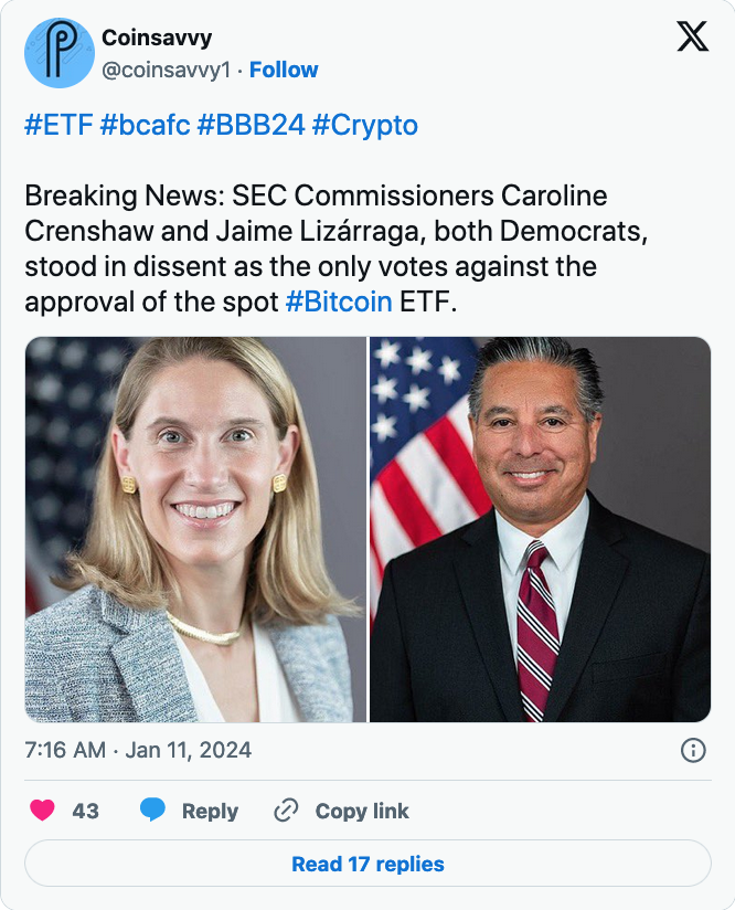 虽然这是一个反思的时刻,但也是一个庆祝的时刻。我并不是在庆祝比特币或与比特币相关的产品;监管机构对比特币的看法并不重要。我庆祝的是美国投资者有权通过买卖现货比特币 ETFs 来表达他们对比特币的看法。我也为市场参与者坚持不懈地将他们认为投资者需要的产品推向市场而感到高兴。面对委员会的阻挠,我对申请人长达十年的坚持表示赞赏。