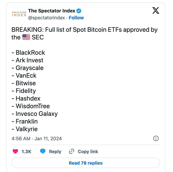经历了X账户遭黑客攻击发布假消息,网站404的抓马,美国SEC一夜间批准了11个比特币现货ETF的申请。