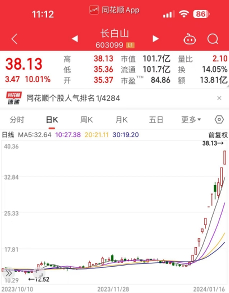 其中主打东北旅游的长白山正迈向连续15个交易日上涨,北京时间1月16日上午,旅游股盘中再度拉升,长白山继续涨停,录得11天9板,成交额超13亿元,股价创历史新高,今年以来10个交易日,长白山涨停8次,涨超130%。