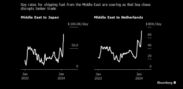 自美英对胡塞发动空袭以来,油轮企业盈利飙升的势头延续,其中一条航线盈利创下2022年以来的最大单日涨幅。统计显示,从中东向亚洲运送燃料的船只运价增长至几乎三倍。自2024年1月12日以来,单日运费从约30,000美元攀升至83,000美元,增长了182%。