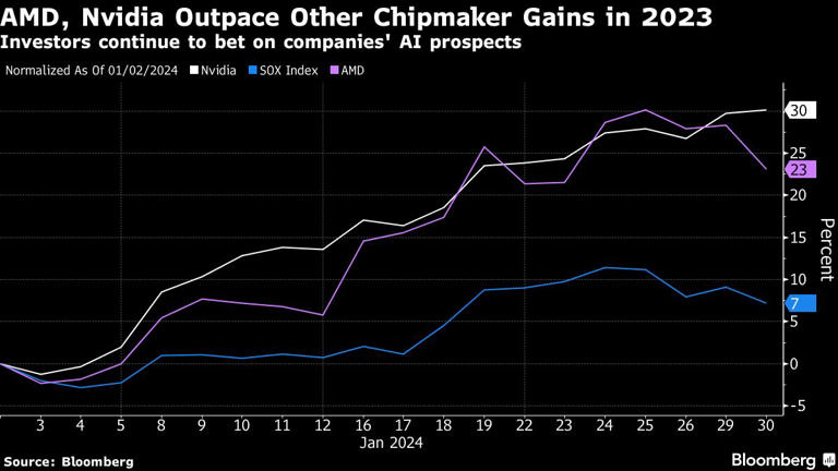 图:AMD和英伟达领涨2023年,大幅领先其他指数涨幅 来源:Bloomberg