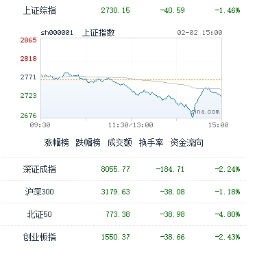 2月2日消息,A股主要指数午后探底回升,尾盘快速拉升,沪指2700点失而复得,此前一度跌近4%,创业板指跌超2%,此前一度跌近5%。银行等高股息权重股拉升护盘,长江电力、农业银行双双创出历史新高,中国神华续创2008年2月以来新高,中国电信、中国石化等涨超2%。各板块普跌,大金融板块尾盘异动拉升,金证股份直线涨停。地产股部分活跃,浦东金桥、深深房A涨停。下跌方面,光伏概念股集体调整,银龙股份、罗普斯金跌停,板块内超20股跌超8%。CRO概念股下挫,药明康德(维权)闪崩跌停。总体来看,个股仍呈普跌态势,近5000股处于下跌状态,两市再超百股跌停,成交今日明显放量,今日成交额8057亿元,北向资金全天净买入23.6亿元,其中沪股通净买入12.93亿元,深股通净买入10.67亿元。