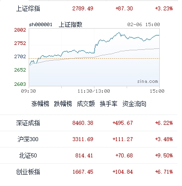 2月6日,A股三大指数今日大幅反弹,截止收盘,沪指涨3.23%,收报2789.49点;深证成指涨6.22%,收报8460.38点;创业板指涨6.71%,收报1667.45点。沪深两市成交额达到9263亿元,北向资金今日大幅净买入126.05亿元。消息面上,证监会指出,操纵市场恶意做空,严重侵蚀老百姓的“钱袋子”,已经站到了全体股民的对立面,扰乱股市健康稳定运行的正常节奏。证监会将保持“零容忍”高压态势,坚决重拳打击,让胆敢违法操纵、恶意做空者“倾家荡产、牢底坐穿”,同时警示,莫要以身试法、火中取栗。