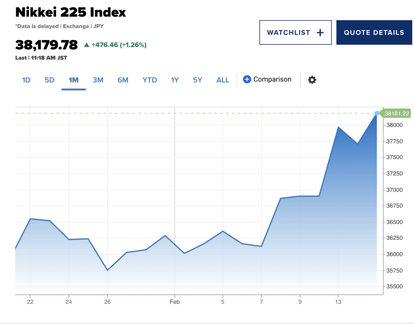 作为对最新GDP数据的回应,日经225指数在早盘上涨0.65%,并一度突破38,000点大关,因为投资者将疲弱的经济数据视为日本央行可能推迟退出该国长期负利率政策的信号。