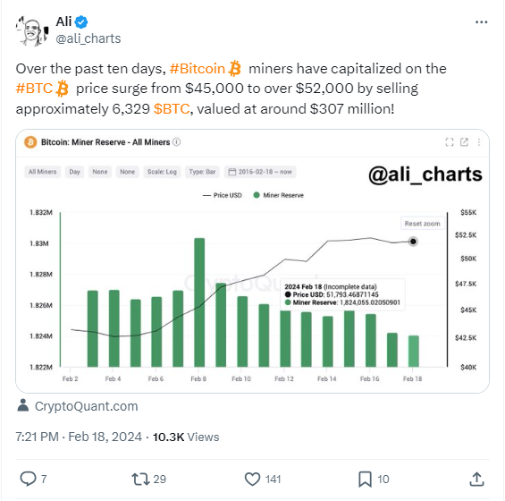 随着比特币价格巩固在52000美元左右,比特币矿商又恢复了抛售热潮。加密分析平台 CryptoQuant 的数据显示,在过去十天里,比特币矿工已经利用了旗舰加密货币价格的上涨。