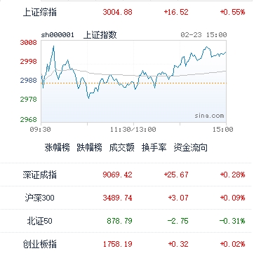 2月23日消息,大盘午后震荡拉升,沪指实现日线八连阳,收复3000点整数关口,创业板指稍显弱势,指数黄白二线分化严重。板块方面,AI概念股持续活跃,Sora概念领涨,维海德6连板,因赛集团、华扬联众(维权)、国脉文化涨停;英伟达概念股走强,中富通、奥拓电子、利通电子、卓朗科技涨停;传媒、短剧概念股集体活跃,宣亚国际、北京文化(维权)、中视传媒、文投控股等涨停。机器人概念股午后拉升,东杰智能、鸣志电器、博杰股份、克来机电、盛视科技等三十余股涨停。汽车产业链活跃,赛力斯、汉马科技涨停。总体来看,个股呈普涨态势,近4400股处于上涨状态,两市再超百股涨停,今日成交额9219亿元,北向资金全天净卖出0.92亿元,其中沪股通净买入28.37亿元,深股通净卖出29.29亿元。