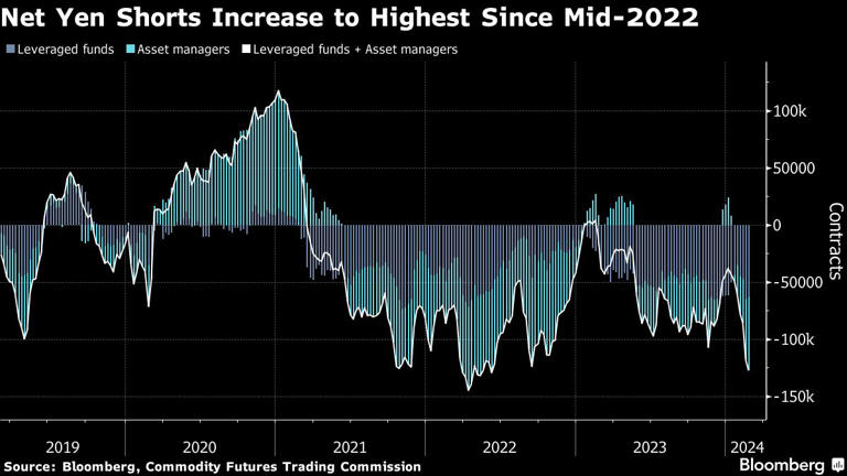 投机者押注日元将进一步下跌。 根据商品期货交易委员会(CFTC)的数据,上周杠杆基金和资管公司持有的净日元空头头寸攀升至2022年年中以来的最高水平。