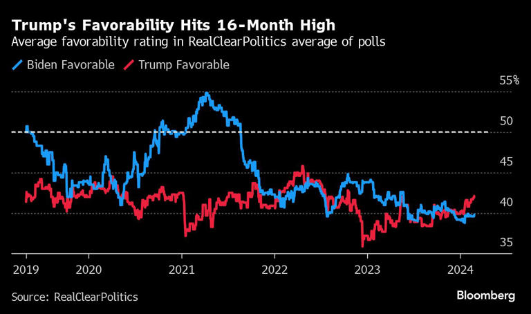 唐纳德·特朗普的平均支持率升至自2022年中期选举前以来的最高点,这位前总统正朝着11月与支持率不及他的乔·拜登再次对决前进。