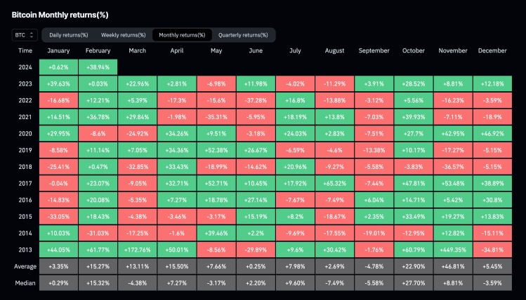 2013年2月仍然保持着最高回报记录,当月回报率为61.77%。然后,在2021年2月,月回报率将达到36.78%,这是2024年2月之前的第二高水平。然而,2月份以绿色结束并不罕见,因为自比特币推出以来,这个月的绿色收盘比红色收盘更多。