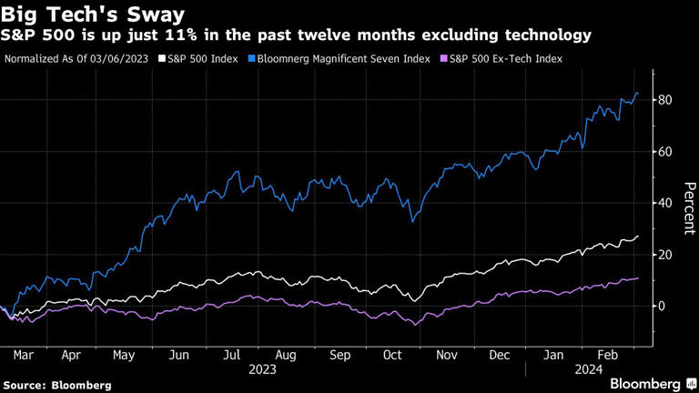 图:标普500指数在去除科技股的前提下上涨了11% 来源:Bloomberg