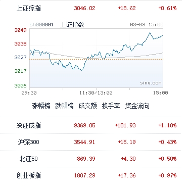 3月8日消息,沪指开盘后窄幅震荡,创业板指一度拉升涨近1%,光伏、AI手机、CPO、军工等方向领涨,旅游、煤炭、贵金属、教育等板块下挫,个股涨多跌少,两市超3700股飘红。指数早间震荡回落,三大指数全线翻绿,创业板指此前一度涨近1%,旅游、贵金属、教育、煤炭等跌幅居前,存储芯片、光伏、AI手机、军工等走势活跃,个股涨跌互现,上午半天两市成交5075亿元。三大指数午后震荡反弹,算力、数据中心概念持续活跃,飞行汽车概念走强。尾盘,深成指、创业板指双双涨超1%,HBM、存储芯片、光伏设备、6G等方向领涨。中国海油尾盘涨停,成交额超20亿元。总的来说,个股涨多跌少,两市超3500股飘红,沪深两市成交额达到8606亿元,北向资金今日净买入60亿元。