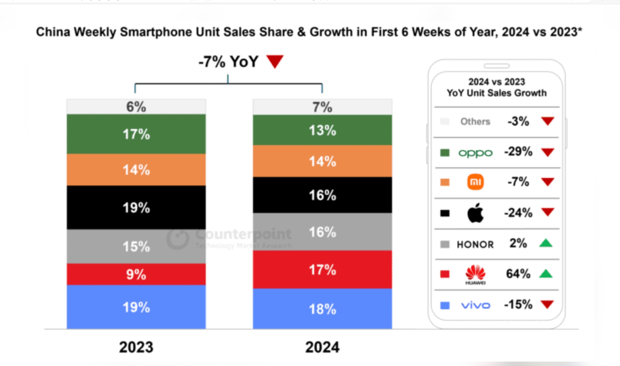 Counterpoint Research的数字可见,今年iPhone的销售量比起上年同期下跌24%,相反华为就大幅上升64%。 中国智能手机销量整体下跌 7%,亦预计今年第一季会出现负增长。