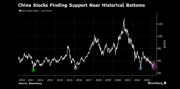 图:MSCI中国指数在底部寻求支撑 来源:Bloomberg
