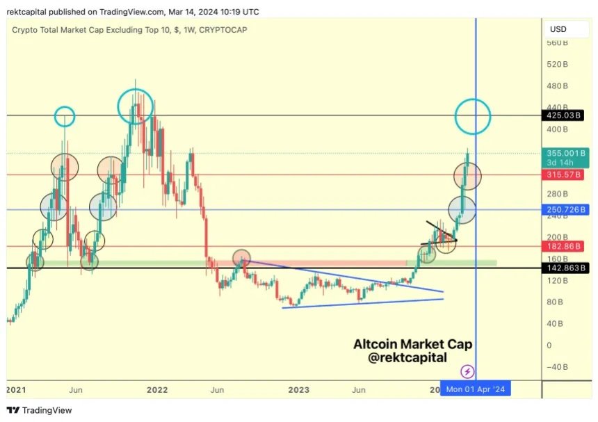 由于比特币已飙升至新纪录高位,许多加密货币分析师预计山寨币市值将大幅上涨。加密货币专家和交易员 Rekt Capital 在 X 平台上与社区分享了有关山寨币市值的积极预测。
