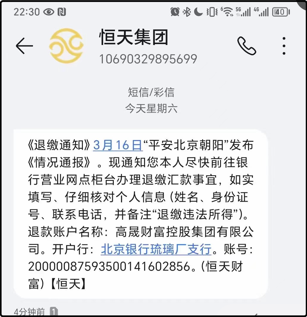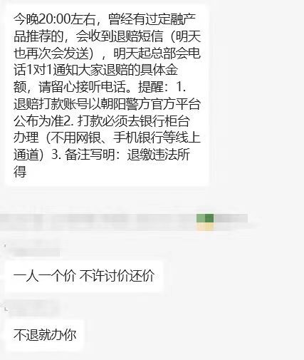 上个周末周末,中植系的高管已经被北京警方采取刑事强制措施,随后发起了针对中植系旗下四大财富平台的追索非法酬金行动。包括了恒天财富、大唐财富、新湖财富、高晟财富,在中植系倒台之前,这4家都是中国前10的财富平台,规模巨大。现在北京警方开始给之前的销售人员群发短信,要求他们主动退款,争取从轻处罚。