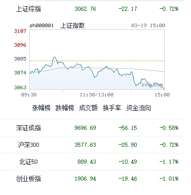 图:今日中国股市主要指数收盘表现,截止收盘,沪指报3062.76点,跌0.72%,深成指报9696.69点,跌0.58%,创业板指报1906.94点,跌1.01%