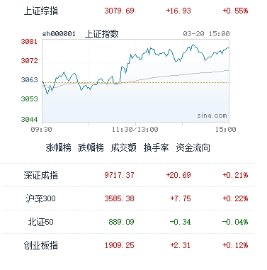 图:今日中国股市主要指数收盘表现,截至收盘,沪指报3079.69点,涨0.55%;深成指报9717.37点,涨0.21%;创指报1909.25点,涨0.12%