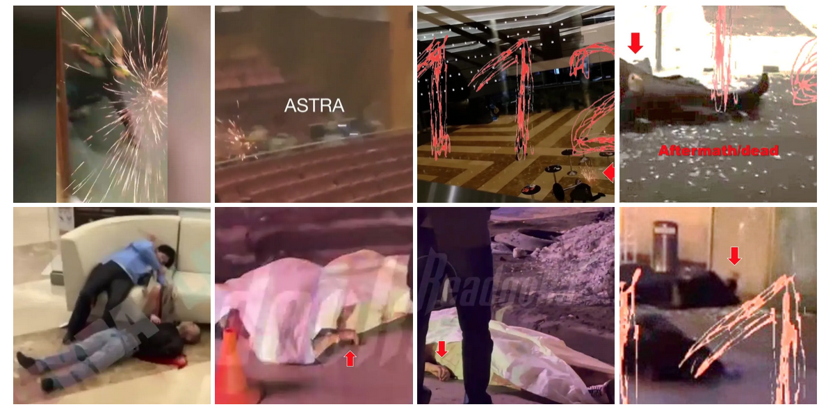 现有的袭击发生后的视频显示,地上既有盖着被子的尸体,也有未盖被子的尸体,但没有一具尸体能以高分辨率近距离观看,而且一些尸体的姿势让人联想到人体模型(如弯曲和抬高的膝盖或手)。