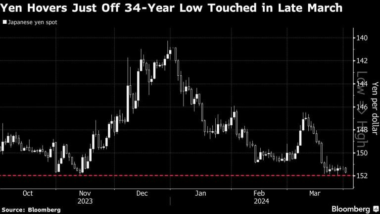图:日元在3月下旬触及的34年低点附近徘徊 来源:Bloomberg