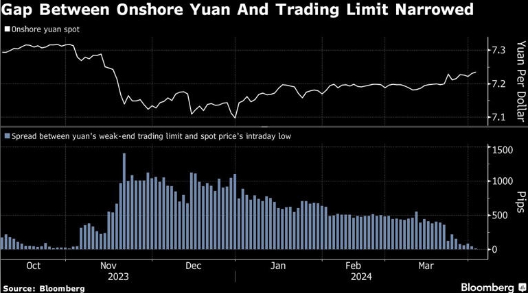 图:在岸人民币涨跌停板价差收窄 来源:Bloomberg