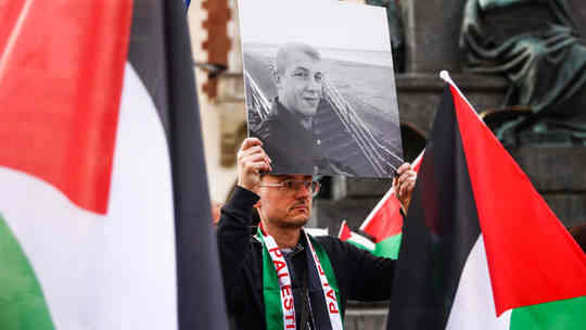 (波兰克拉科夫的一名示威者展示了周一在以色列无人机袭击中丧生的一名援助人员的照片)