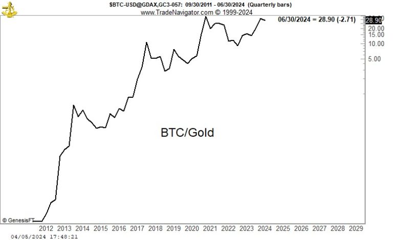 这位资深交易员解释说,勃兰特还附上了一张图表,“代表了购买一个比特币所需的黄金盎司数”。勃兰特指出:“在过去的50年里,黄金价格的复合年增长率为5.2%,勉强超过美国消费者价格指数。”