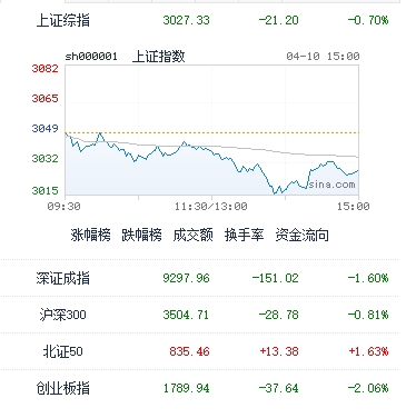 图:今日中国股市主要指数收盘表现;截至收盘,沪指报3027.33点,跌0.70%;深成指报9297.96点,跌1.60%;创指报1789.94点,跌2.06%