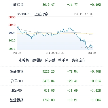 图:今日中国股市主要指数收盘表现;截至收盘,沪指报3019.47点,跌0.49%;深成指报9228.23点,跌0.78%;创指报1762.88点,跌1.08%