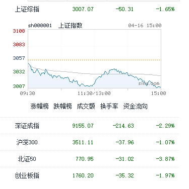 图:截至收盘,沪指报3007.07点,跌1.65%;深成指报9155.07点,跌2.29%;创指报1760.20点,跌1.97%