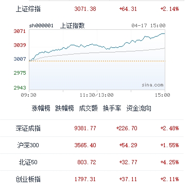 图:截至收盘,沪指报3071.38点,涨2.14%;深成指报9381.77点,涨2.48%;创指报1797.31点,涨2.11%