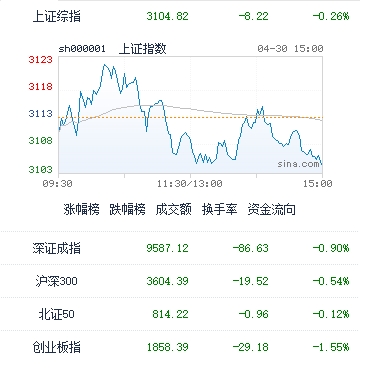 4月30日,A股三大指数今日集体回调,截止收盘,沪指跌0.26%,收报3104.82点;深证成指跌0.9%,收报9587.12点;创业板指跌1.55%,收报1858.39点。沪深两市成交额达到1.03万亿元,北向资金今日净卖出86.17亿元。