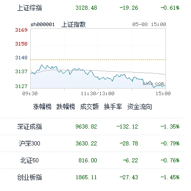 图:今日中国股市主要指数收盘表现 截至收盘,沪指报3128.48点,跌0.61%;深成指报9638.82点,跌1.35%;创指报1865.11点,跌1.45%